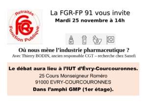 Où nous mène l’industrie pharmaceutique ? Débat mardi 25 novembre à 14h, à l’IUT d’Evry 2025-11-11T14:51:21+01:007 novembre 2025|Catégories : À LA UNE, Retraites|Mots-clés : DÉBATS| Partagez cet article ! FacebookXWhatsAppTelegramEmail Articles similaires 8 Heures pour la Palestine : samedi 22 novembre 2025, à la Maison des Syndicats à Evry 8 Heures pour la Palestine : samedi 22 novembre 2025, à la Maison des Syndicats à Evry 8 novembre 2025 Contre les OQTF le mercredi 19 novembre : défendons toutes et tous ensemble les droits des jeunes étrangers scolarisés ! Contre les OQTF le mercredi 19 novembre : défendons toutes et tous ensemble les droits des jeunes étrangers scolarisés ! 7 novembre 2025 Budget des collèges et des lycées : vigilance dans vos conseils d’administration ! Budget des collèges et des lycées : vigilance dans vos conseils d’administration ! 7 novembre 2025 F3SCT Education Nationale du jeudi 6 novembre : notre compte-rendu F3SCT Education Nationale du jeudi 6 novembre : notre compte-rendu 6 novembre 2025 En novembre et décembre, la FSU 91 est dans l’action ! En novembre et décembre, la FSU 91 est dans l’action ! 5 novembre 2025